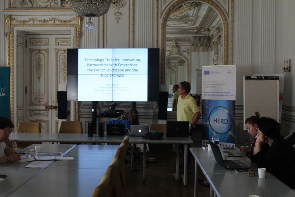 Following the training on R&D strategy delivered in Batumi (Georgia) last June by UNS/Université Côte d'Azur staff involved in research management at steering level and at support level, Université Côte d'Azur welcomed representatives of Georgian universities and research institutions in the framework of the HERD project (Erasmus + programme) in Nice for the week of October 7-11, 2019. The main goal of the study visit was to better understand the R&D strategy of Université Côte d'Azur. The agenda included detailed presentations, visits to various university sites and laboratories, and individual meetings in order to develop stronger ties of cooperation between France and Georgia. The different departments of Université Côte d'Azur have mobilized in order to prepare an intense and comprehensive program meant to give our counterparts a vision of UNS organization, its structuring program s, projects and actors in research and innovation.