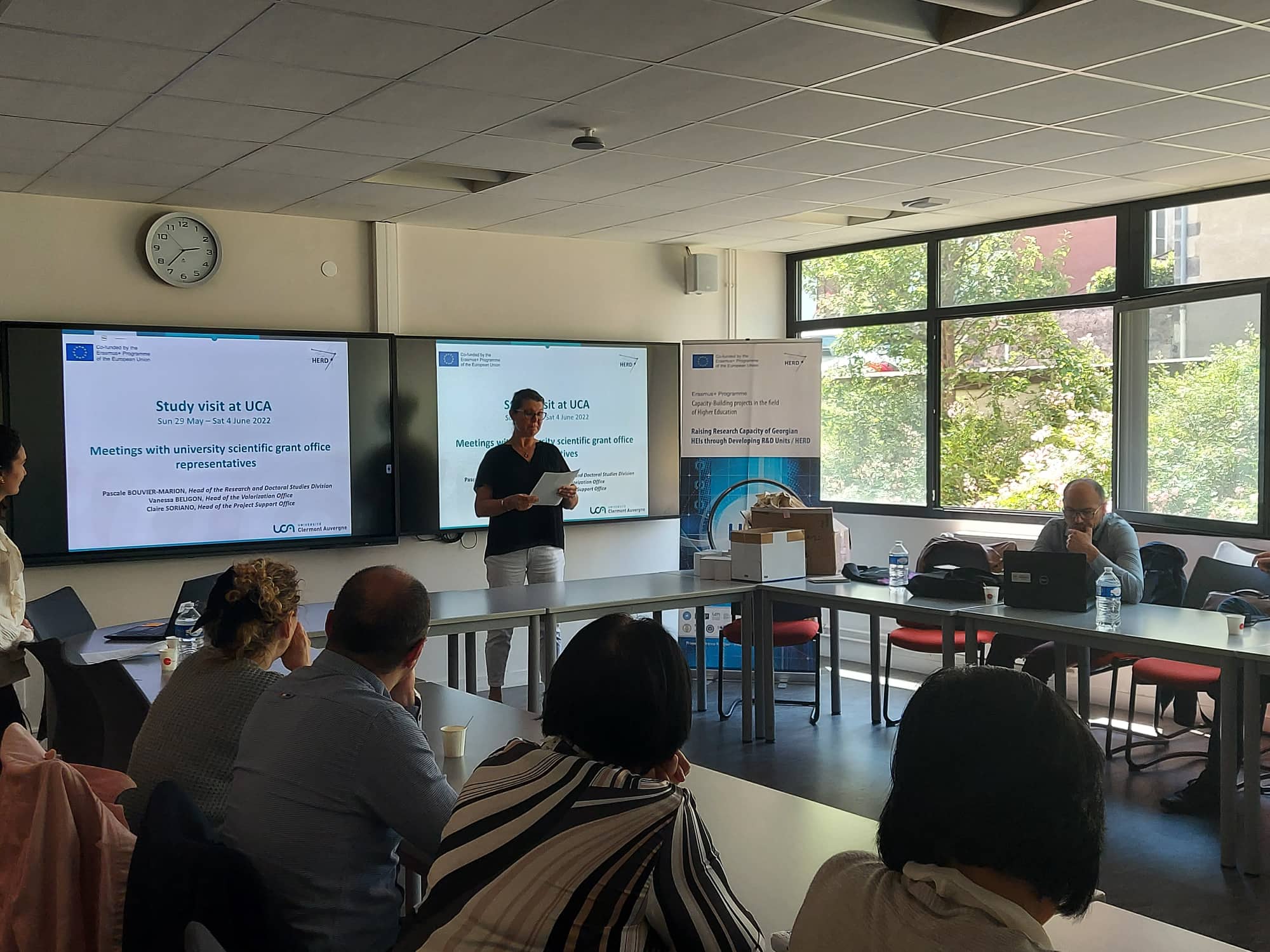 From 28th of May UCA - Université Clermont Auvergne (France), one of the project's international partners, hosted a week-long study visit to HERD representatives. Representative of the Ministry of Education and Science ofGeorgia, Mindia Okujava – deputy head of the Division of Science and Technology of the Science Development Department also participated into the study visit.The Université Clermont Auvergne (UCA) was created on January 1st 2017, from the merging of the Université Blaise Pascal and Université d’Auvergne. With 35.000 students, including 4.600 (13%) international ones, and 3.300 staff, UCA plays a key role in the territorial structuration and the building of a European level region. Its 20 Faculties and 5 DoctoraI Schools offer more than 170 training programs. UCA strongly supports a wide range of European and international exchanges, through study grants, joint degrees, co-supervised theses and collaborative research. UCA has further started some years ago to develop its international cooperation more effectively, e.g. through its involvement in several Leonardo and Tempus projects, and it is pursuing this effort through various projects in the new Erasmus+ and Horizon2020 programs. UCA is located in the Auvergne region, which combines rural areas with a wide range of industries, from SMEs to international groups, some of them having their headquarters in Auvergne (Michelin or Limagrain). UCA has long ago chosen to open up to society in general. Its national diplomas can be obtained through either initial or continuing education programs; specific training and facilities are proposed to a non-student public, in connection with the social and institutional local surroundings. UCA also hosts thirty-one laboratories and research teams, is committed to several laboratories of excellence, regional clusters and competitiveness centers, and takes part in a lot of prestigious projects including research, innovation and high-technology. The new university and its regional partners has just been awarded (Feb 2017) an I-Site label, namely "Program Investing for the Future 2" which integrates engineering schools, industry and research laboratories in one of 12 major poles of research in France.